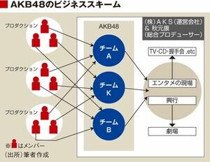 つまり、AKB48と名乗れるメンバーは決まっていますが、観客が目にするAKB48は、エンターテインメントの現場に応じて、その場その場で編成されるプロジェクトチームなのです。このAKB48のマネジメントは運営会社の株式会社AKSによって行われ、総合プロデューサーが秋元康氏です。