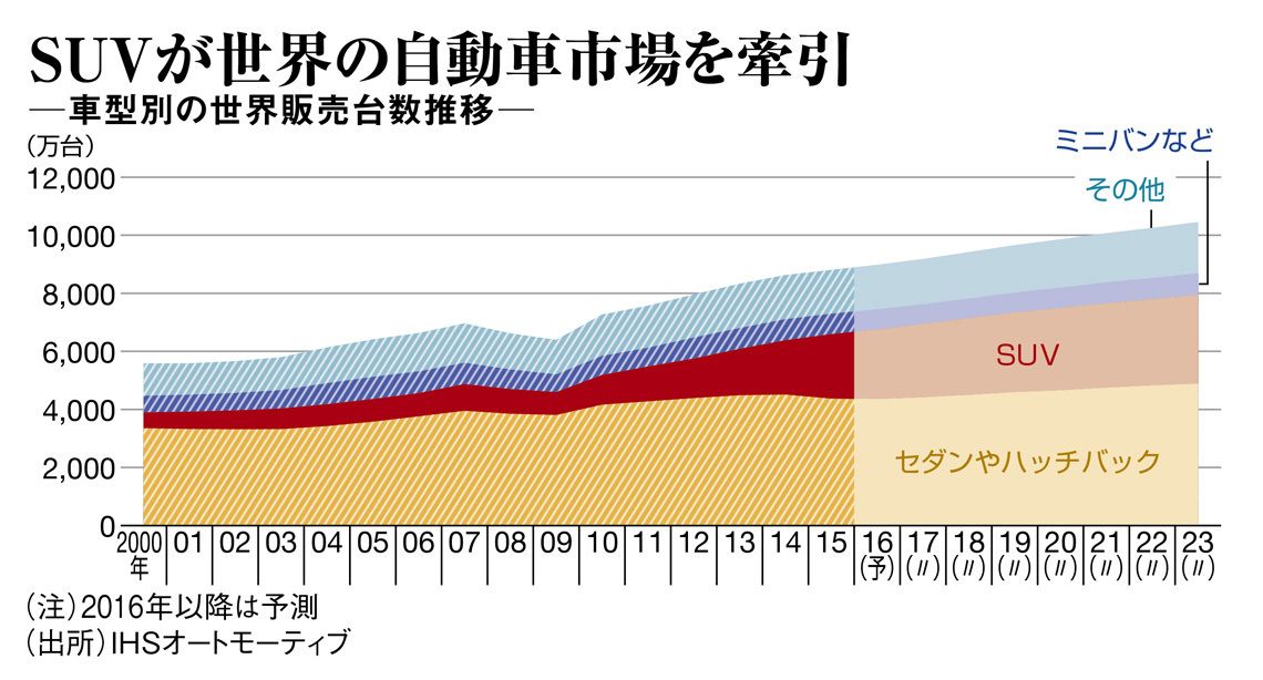 そこで各メーカーは台数を増やすよりも、1台当たりの収益を引き上げる方向に転換した。その一つが、セダンやハッチバックよりも利幅が大きい、SUVの開発に注力することだった。