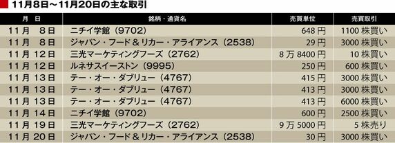 理由は昨年9月に東証マザーズに上場していた英会話スクールのGABA(旧2133)をTOBにて完全子会社化したが、受講生数が計画を下回ることが原因のようだ。大証2部上場で食料品のJFLA(ジャパン・フード・リカー・アライアンス2538)を29円で3000株買う。