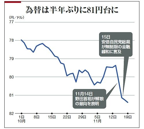 首相のいすに最も近い人物とされる安倍晋三・自由民主党総裁の発言が金融市場をにぎわしている。12月16日の衆議院議員選挙に向けて、同氏の提唱する金融緩和政策が円安を誘い、株価が上昇したからだ。