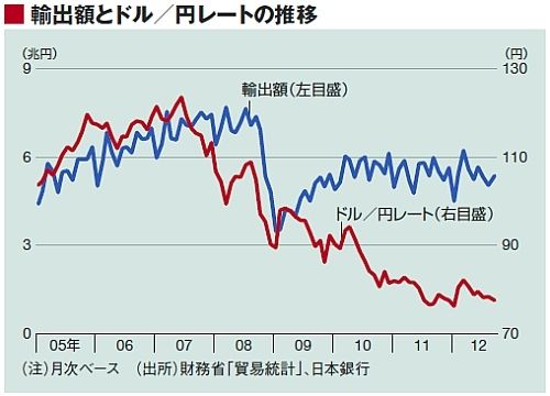 しかし、図のように、ドル/円レートの変調は、07年5月頃から始まっていたのである。6月に1ドル=123円の円安のピークをつけた後、急激な円高に転じ、08年5月には100円を突破する水準になっていた。つまり、ここまでで、2割を超える円高になっていたのだ。しかし、輸出は増え続けた。前回述べたように、フロー変数の調整は、通常は価格変化に遅れるのだ。