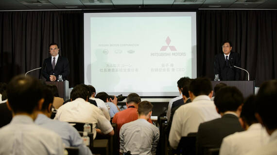 【5月12日(木)】深夜メールチェックをしていたら、0時59分、日経速報メールが届き、「日産、三菱自に3割強出資、2000億円で筆頭株主に」とあった。午前1時39分、ヤフーニュースの一番上に「三菱自、日産の事実上傘下に」とトップニュース扱い。三菱自動車(7211)の昨日の終値は、11円高の495円であったが、PTS(夜間取引)終値は12.1円安の482.9円と安かった。また、午前3時59分、海外でのADR(円換算)ではすぐに反応し59円高の554円となった。NYダウは、217ドル安の1万7711ドルと大幅安。
