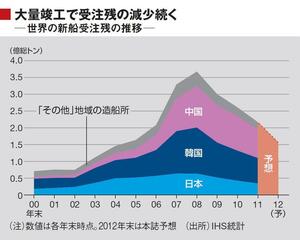日本造船工業会によると、国内の主要造船会社による11年の新船受注量は770万総トンと前年から4割近く減少。リーマンショック直後の09年実績(850万総トン)をも下回り、過去15年間で最低水準にとどまった。12年に入っても同様の状況が続いているため、手持ち工事量は目に見えて減っている。6月末時点の受注残は約3000万総トンとピークだった07~08年当時の半分弱で、しかも、その大半が13年末までに竣工・引き渡しを迎える。