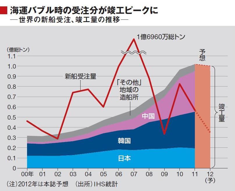 当時、韓国勢の追い上げで劣勢に立たされていた日本の造船業界は、この“神風”でにわかに活気を取り戻す。国内外から次々に舞い込む新船建造の依頼。各社とも受注残(=手持ち工事)は建造能力の数年分にまで積み上がり、たちまち国内の造船所はどこもフル操業に。10年には初めて日本の竣工量が2000万総トンの大台を超え、12年も国内造船所の稼働率は依然高い。