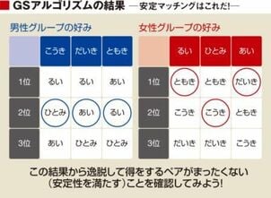 まず、参加者たち全員から異性グループのメンバーに対する好みをランキングしてもらう必要がある。そして、その好みに基づいて機械的に次の作業を行う。
