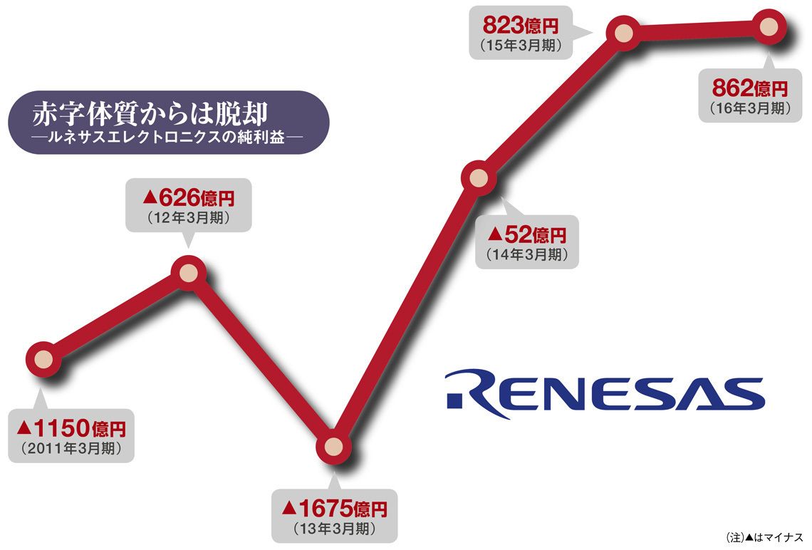 ルネサスは、世界トップの車載用マイコンをはじめ、自動車用半導体に強みを持つ。長らく赤字が続いていたが、数度にわたる大規模なリストラと円高一服の追い風もあり、直近2期の純益は800億円台の黒字を計上した。