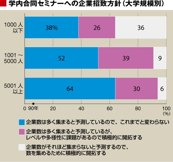 学内合同企業セミナーへの企業招致について問うた設問の結果が興味深い。大規模校では「企業数は多く集まると予測しているので、これまでと変わらない」(64%)との回答が3分の2近くを占めている。ところが中規模校では52%と半数近くに低下し、小規模校では38%しかない。