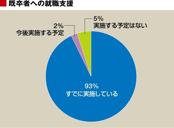 大学にとっても未内定のまま卒業した既卒者への対応は、大きな課題になっている。そこで既卒者就職支援について聞いたところ、「すでに実施している」(93%)と大多数の大学が取り組んでいる。また「今後実施する予定」(2%)もある。