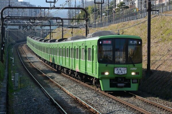 最近話題に乏しい京王線で目立つのが、緑に塗られた8000系の「高尾山ラッピング電車」である。車内は一般車両と変わらないが、車体に四季折々の高尾山の様子を描いていて見ているだけでも楽しめる。