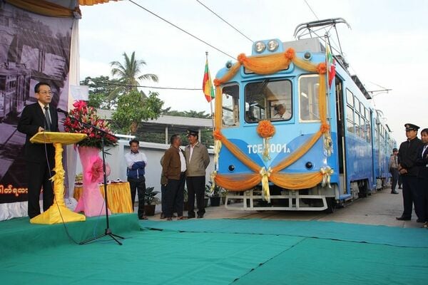 広島電鉄の車両によるミャンマー初の路面電車。1月の記念式典であいさつする樋口建史・駐ミャンマー日本大使(左)