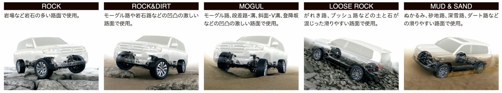 しかしランクルは、200とプラドではオンロード走行を考慮して前輪のみリジッドアクスルから独立懸架に変更したものの、ラダーフレームやローレンジは全車が堅持しており、そのうえでステアリング操作だけで悪路を走破していけるクロールコントロール、路面状況に適した走りを5モードから選べるマルチテレインセレクトなどのデバイスを追加している。