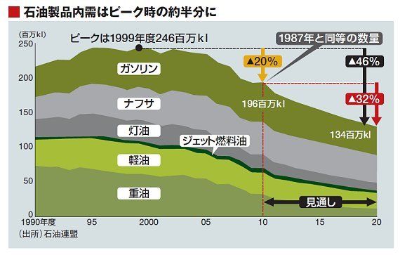 経済産業省の需要想定検討会の見通しでは、20年には99年比半減近い1.34億キロリットルまで減少すると予想される。