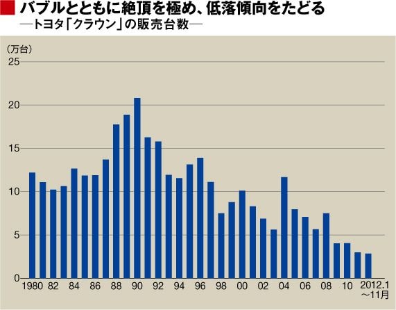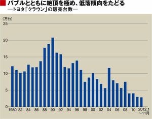 クラウンの歴史は日本経済の縮図でもある。栄華を極めたのはバブル経済の絶頂からほどない1990年。年間販売台数は20万台を超えた。ところが、その後は低落傾向をたどっている。モデルチェンジのたびに少し盛り返しても、長期的なトレンドでみれば販売台数は右肩下がり。今年の販売台数は3万台前後と、ピークから8割以上も減少しているのだ。