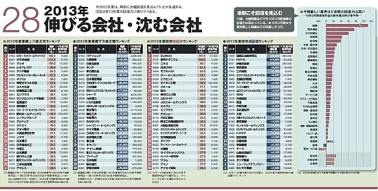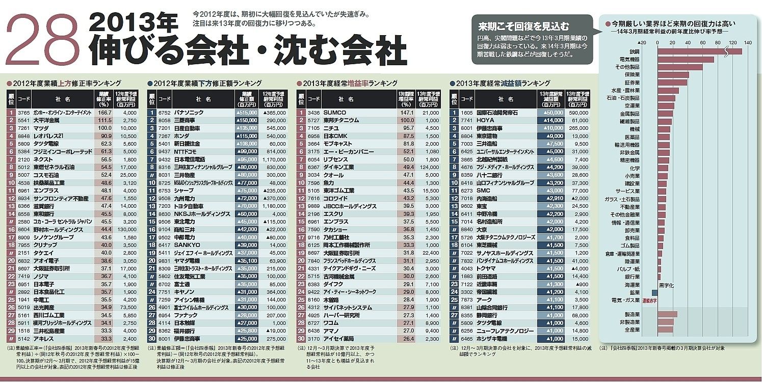 来13年度に好調が期待される「経常増益率ランキング」では、半導体向けシリコンウエハ大手のSUMCOが、シリコンウエハの回復と合理化効果を見込んで大幅増益となりそう。またバッテリー式フォークリフトのニチユは、13年4月、三菱重工業からフォークリフト事業を継承することで業容が膨らむ。