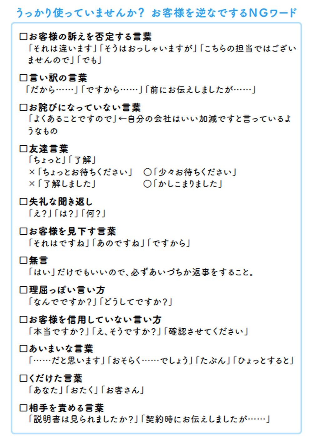 最初に「感じのいい人だ」と思われるためには、対面であれば服装、姿勢、態度、電話であれば声のトーンなどが大切になります。ご自身が、相手に良い印象を与えることができているか、今一度確認してみましょう。