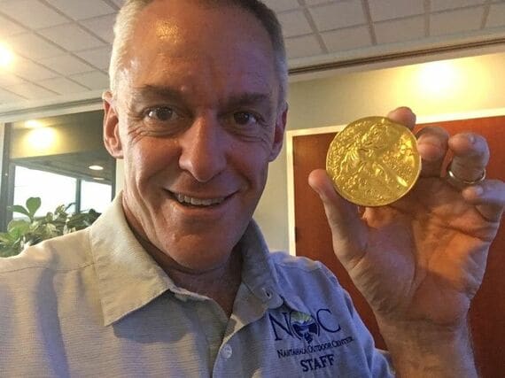 6月20日、1992年バルセロナ五輪のカヌー競技で米国出身のジョー・ヤコビさんが獲得した金メダルが今月車から盗まれた事件で、メダルが6歳の少女に発見され、返却されたことが分かった。写真は返却されたメダルを見せるヤコビさん。ヤコビさん提供(2016年 ロイター)