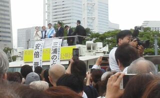 三浦氏と一緒に街宣車上にいた安倍首相は、これを受けて「自信をもって推薦した三浦さんから決意表明を聞いた。推薦したのは間違いないと確信した」と語り始め、この選挙で大いに展開している民進党と共産党の批判に繋げていった。