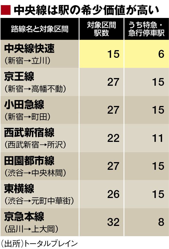 中央線の速さは郊外に行くほど強さが発揮される。中央線の立川からどの列車に乗っても36分以内に新宿に到着するのだ。一方で、田園都市線の場合、中央林間から渋谷まで所要時間30分台の急行は82本だけ。どの路線も、郊外から都心へアクセルする利便性は中央線に比べると見劣りする。