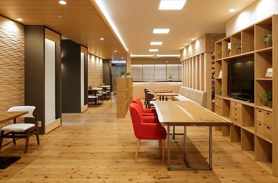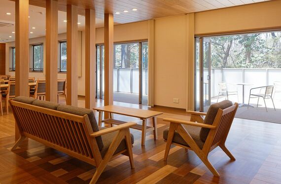 数寄屋門風の門扉や、厚さ30ミリの吉野杉の床板をはじめ、共用リビングダイニングには無垢材のダイニングテーブルが置かれるなど、随所に木の質感が生かされ、まるで和風旅館の趣となっている。看護師2名、介護福祉士9名という手厚いスタッフ陣容で、ハード・ソフト両面で上質さを追求。このため高めの家賃設定にもかかわらず、開所後間もなく満室になったという。