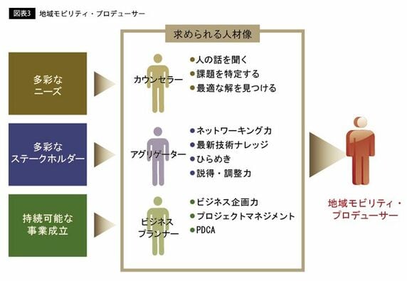 そこで求められるのは、「地域モビリティ・プロデューサー」とでもいうべき新たな存在だ(図表3)。それは、多彩なニーズを吸い上げるカウンセラー的な役割、多彩なステークホルダーを巻き込むアグリゲーター的な役割、持続可能な事業を成立させるビジネスプランナー的な役割を担うことができる人材だ。そうしたプロデューサーがハブとしての役割を担い、政府、自治体、地元事業者、交通事業者、メーカーなどを巻き込んだコンソーシアムもしくは協議会のようなビジネスプラットフォームを構築し、事業を推進していく。