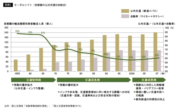 ここから何がいえるのか。それは、東京はモータリゼーションが進んだ都市でありながら同時に公共交通機関も利用する、バランスの良い都市だということだ。個々人の移動を考えた場合、マイカーは移動の自由度・快適性の観点では非常に優れた交通手段といえる。他方でモータリゼーションの行きすぎた進展は、渋滞や事故、環境汚染などで社会の持続的成長に弊害をもたらす。