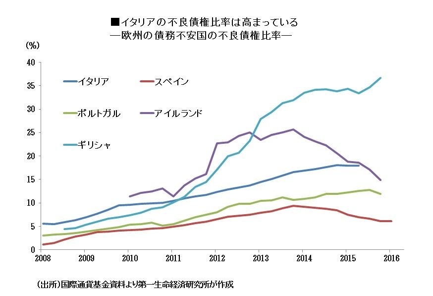 イタリア政府は今年4月に民間銀行等が出資する銀行救済基金(アトランテ)を創設したが、既に複数の小規模銀行の資本増強に用いた結果、大規模行の資本増強に充てる資金的な余力はない。余力増強のために民間銀行などに出資額の引き上げを打診しているが、色よい返事は返ってきていない状態だ。公的支援による銀行救済にはEUのルールが立ちはだかる。
