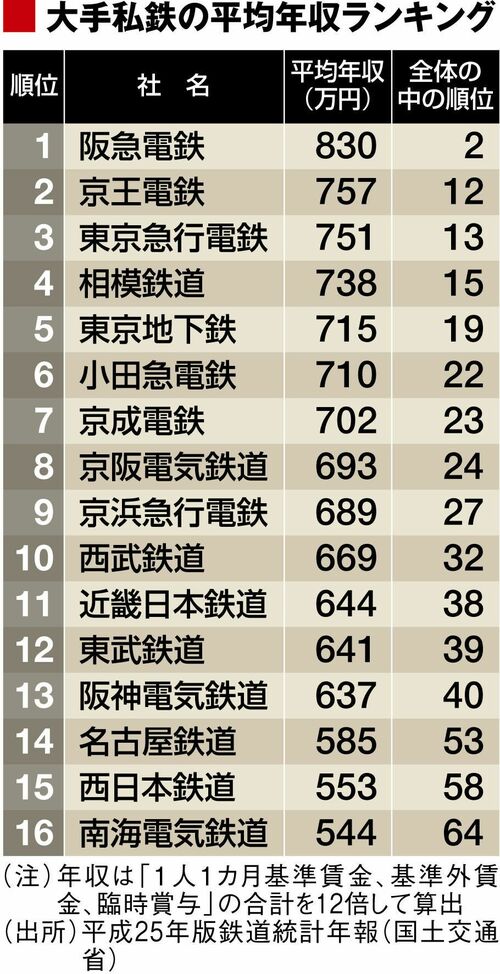 続いて大手私鉄16社の平均年収だ。トップは阪急電鉄の830万円、2位は京王電鉄の757万円、3位は東京急行電鉄の751万円。大手私鉄全体の平均年収もJRと同じく680万円だった。