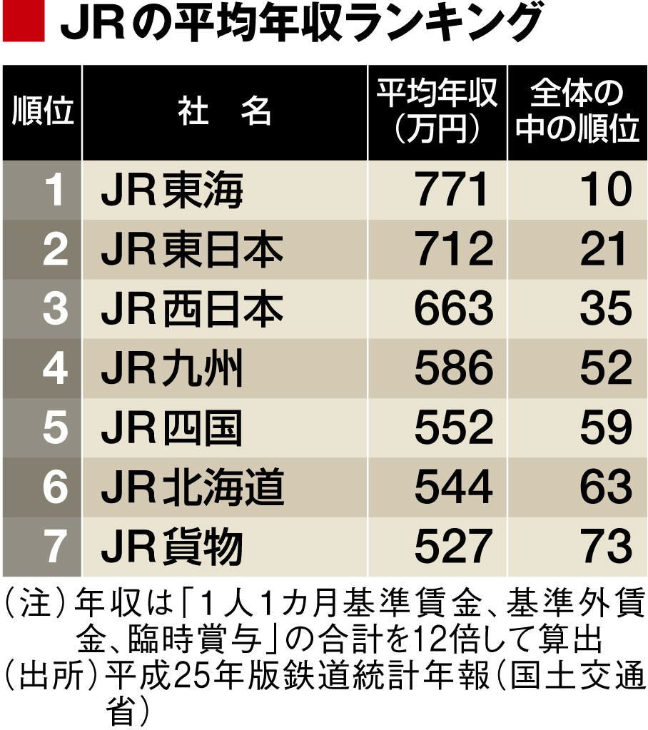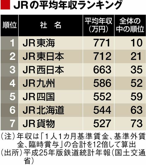 JRだけを平均年収の高い順に抜き出すと、トップは東海の771万円、2位は東日本の712万円、3位は西日本の663万円となる。JR7社の平均年収は680万円。JRでトップの東海と最下位の貨物では244万円もの開きがある。