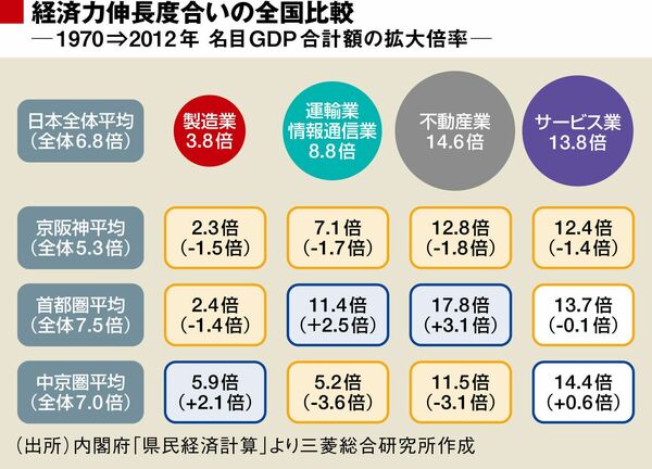 左図は、首都圏(東京、千葉、埼玉、神奈川)と中京圏(愛知、岐阜、三重、静岡)も含めて、主要な産業別の伸長倍率を全国平均と比べてみたものである。京阪神経済は、(ここに示した分野以外も含めて)すべての産業分野で、全国平均をはっきりと下回っていることがわかる。一方で、首都圏は、「不動産」「運輸業/情報通信業」で圧倒的な拡大傾向をみせている。中部圏は「製造業」において、圧倒的に伸びている。