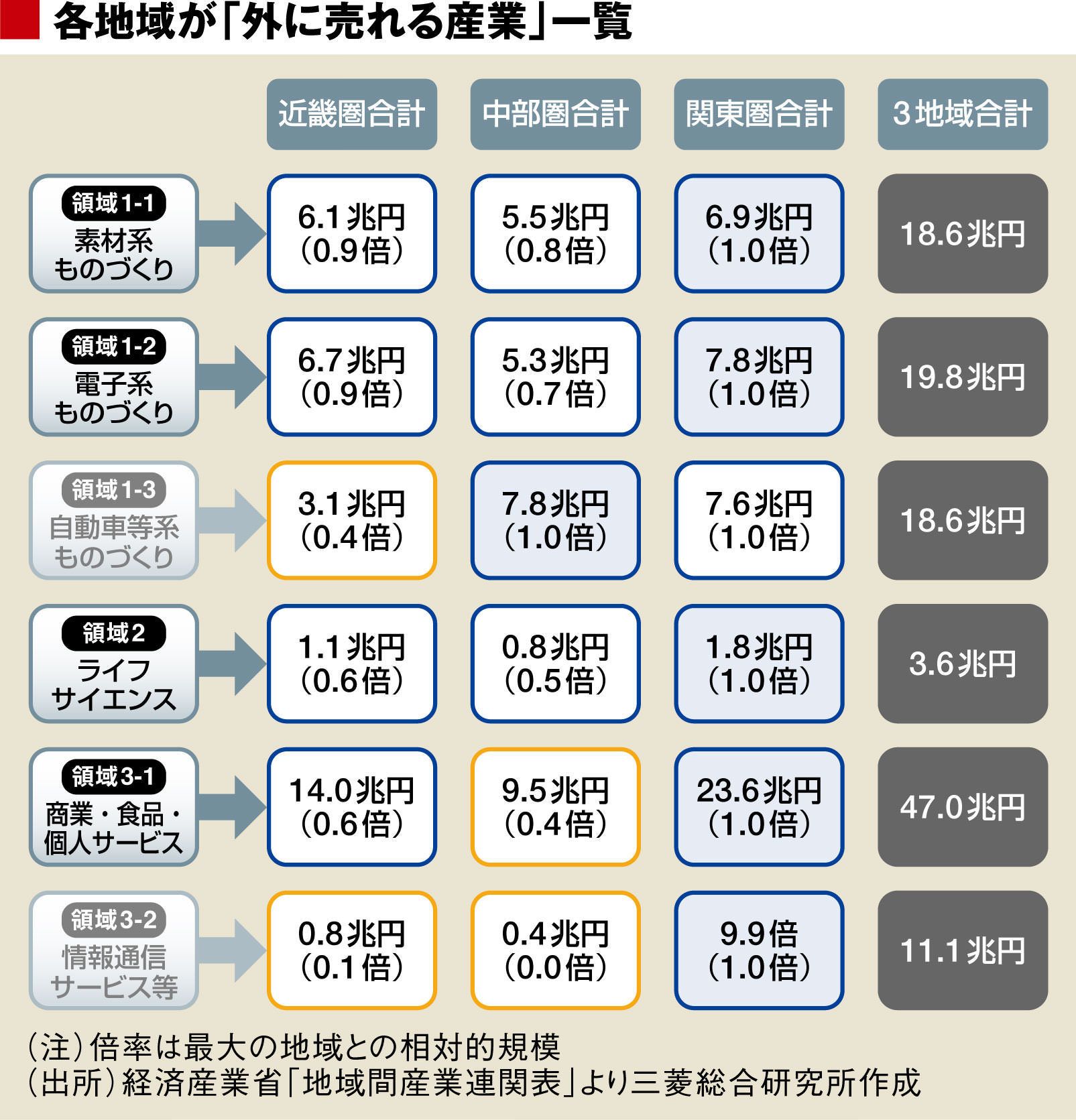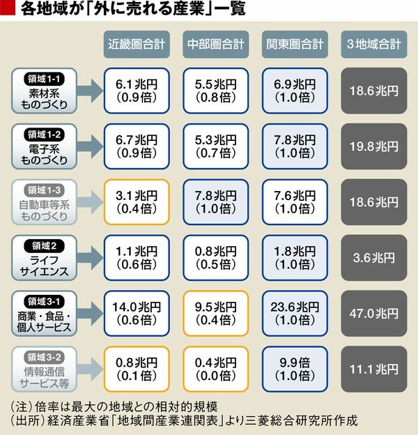 経産省が公表している「地域間産業連関表(53分類)」を使って近畿圏、中部圏、関東圏それぞれで移出・輸出額の大きい15産業を抽出し(3地域で重複を除くと24産業)、共通点の大きそうな産業分野をくくって、6領域にまとめたのが上図である(最新データが平成17年しかないため、約10年前のデータであることを考慮する必要がある。なお、ここでの地域割りは、地域経済産業局の区分に従う。近畿は福井を含む2府5県。関東には新潟、山梨、長野、静岡を含む。中部は愛知、岐阜、三重、富山、石川)。