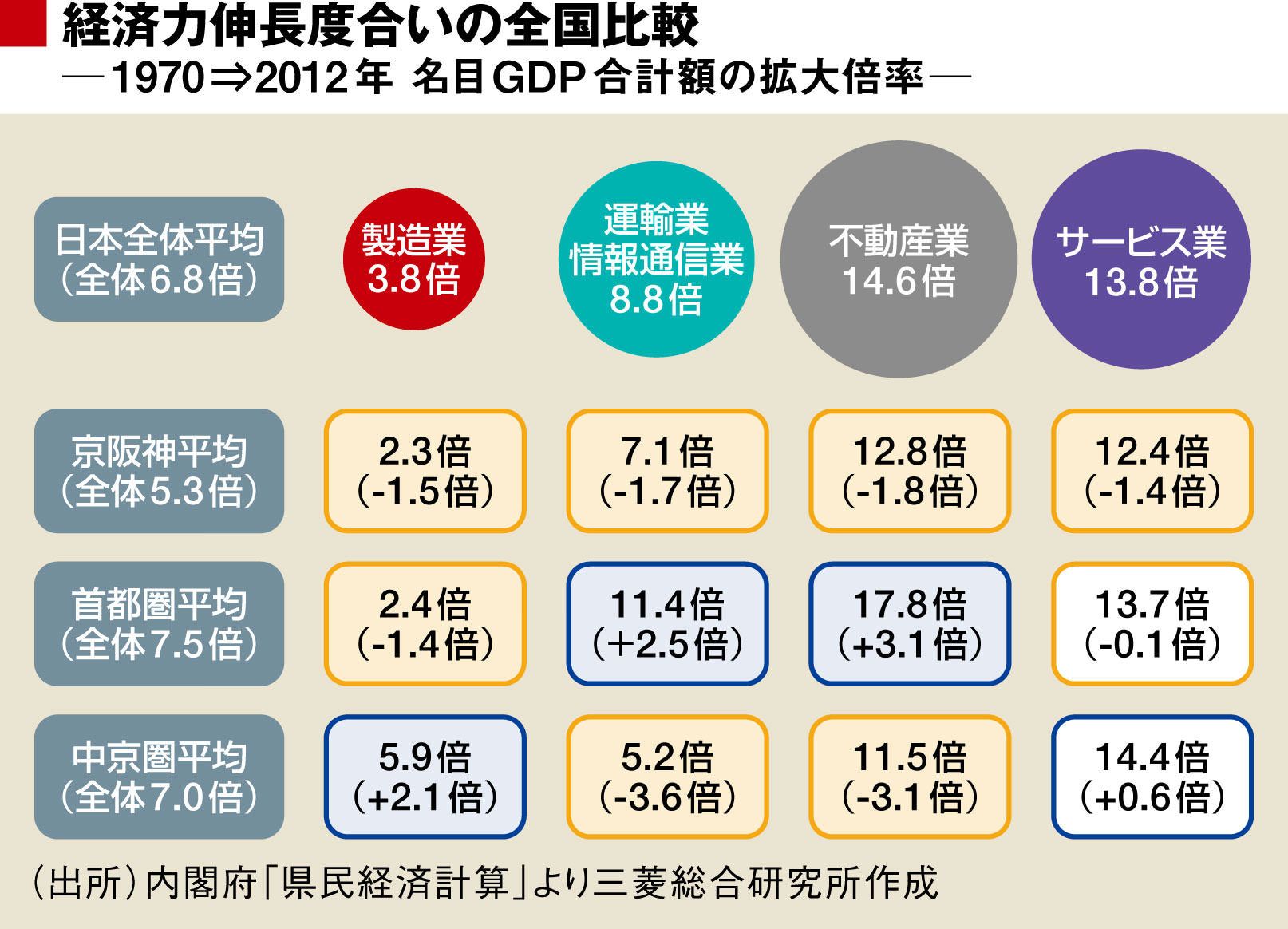 つまり、首都圏は、技術革新と一極集中の影響の大きい「情報サービス」「不動産」「金融」などを中心に、第二次産業から第三次産業に構造展開を果たして、大きく発展した。中部圏は第三次産業の一定レベルの発展はさせつつも、「自動車産業の拡大・維持」で発展しつづけた。一方で、京阪神経済は特徴を持った発展ができず、結果、他の地域に比べて成長力が鈍化してしまった。