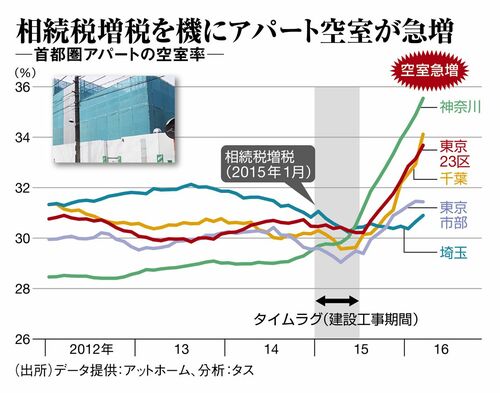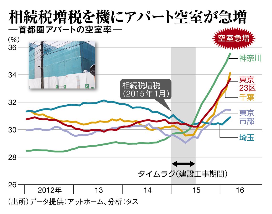 不動産調査会社タスの調べによれば、首都圏の賃貸アパートの空室率は2015年半ばから上がり始め、神奈川県では35%超に達している。千葉県、東京23区も34%前後へ上昇。3室に1室が空室というありさま。