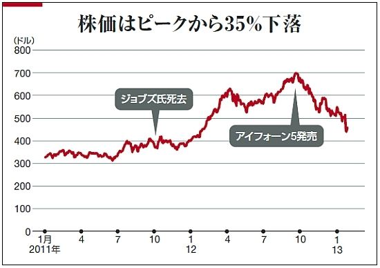 アップルの株価下落が続いている。1月23日に発表した2013年度第1四半期決算(12年10~12月)は、売上高こそ前年同期比18%増と高成長を維持したものの、純利益は前年同期比0・1%増と横ばい。決算発表時点では500ドル近辺だった株価の下落は止まらず、1月25日には440ドルを割り込んだ。昨年9月の700ドルと比べると35%も落ち込み、1年ぶりに株式時価総額ナンバーワンの地位をエクソンモービルに明け渡した(図)。