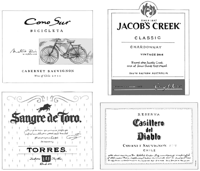「コノスル」(左上)、「ジェイコブス・クリーク」(右上)、「サングレ・デ・トロ」(左下)、「カッシェロ・デル・ディアブロ」(右下)