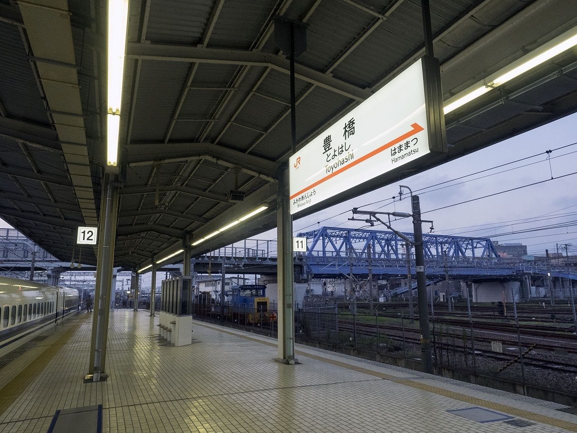 浜名湖を過ぎて愛知県に入った新幹線は、豊橋に到着。ここは17ある東海道新幹線の駅の中でも品川、米原と並んで3カ所しかない、ホームが地上と同じ高さにある駅だ。駅の前後は高架線なのに、豊橋駅周辺だけが地上に降りているのは、駅のすぐ北側(新大阪方)に県道388号線の城海津(しろかいづ)跨線橋があるからだ。