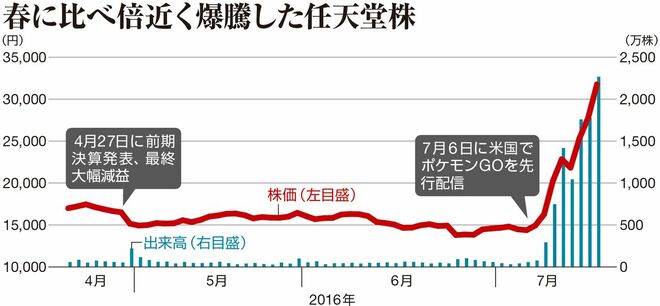 海外で先行した動きに株式市場は敏感だ。『ポケットモンスター』(ポケモン)のキャラクターを抱える、任天堂の株価はグングンと上がり、春先の1万4000円台から一時3万2000円台と、6年3カ月ぶりの高値をつけた。関連銘柄も高騰し、市場は“ポケモノミクス”とはやし立てる。その後に反落したものの、しばらく目が離せない。