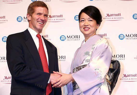 2月7日に行われた記者会見には、来日したマリオット・インターナショナル副会長のジョン・W・マリオット3世(現会長の息子、写真左)が出席。森トラスト側は森章社長の長女で同社専務の伊達美和子・森トラスト・ホテルズ&リゾーツ社長(写真右)が臨席し、業務提携の調印を交わした。