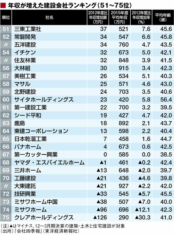 ランキング上位の顔ぶれは、過去の赤字体質から脱出した”敗者復活組”が多い。3位の浅沼組は大阪本社の老舗中堅ゼネコン。経営不振が続いていたが、首都圏の再開発案件など建築工事が好調で息を吹き返した。4位の熊谷組は建築から土木まで幅広く手がけるが、もともと大型の公共工事が得意で、”トンネルの熊谷”ともいわれる。他にもこの3年で年収が100万円近く増えた中堅ゼネコンは少なくない。