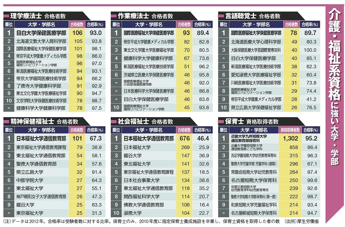 介護・福祉系では国際医療福祉大学の強さが光る。同大の保健医療学部(栃木県)は、作業療法士と言語聴覚士で合格者数が最多。また、理学療法士で3位、看護師でも6位に入っている。同大にはほかに小田原保健医療学部(神奈川県)、福岡リハビリテーション学部(福岡県)があり、それらも理学療法士や作業療法士、言語聴覚士などで上位10大学に入っている。