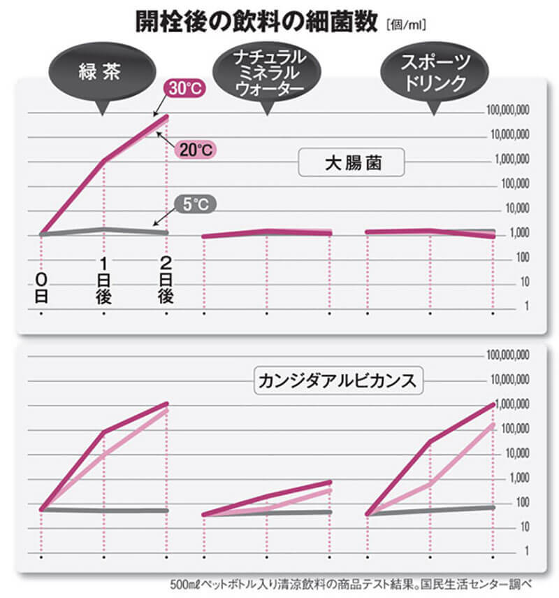 すると手などから汚染する大腸菌は、水やスポーツドリンクではほとんど変化がないのに対し、緑茶では1日後に20度で881倍、30度で1千倍に急増し た。緑茶は中性に近いため菌が増殖しやすいのだという。一方、口腔内の常在菌で口内炎を引き起こすカンジダアルビカンスは、温度が高いとどの飲料でも増殖した。
