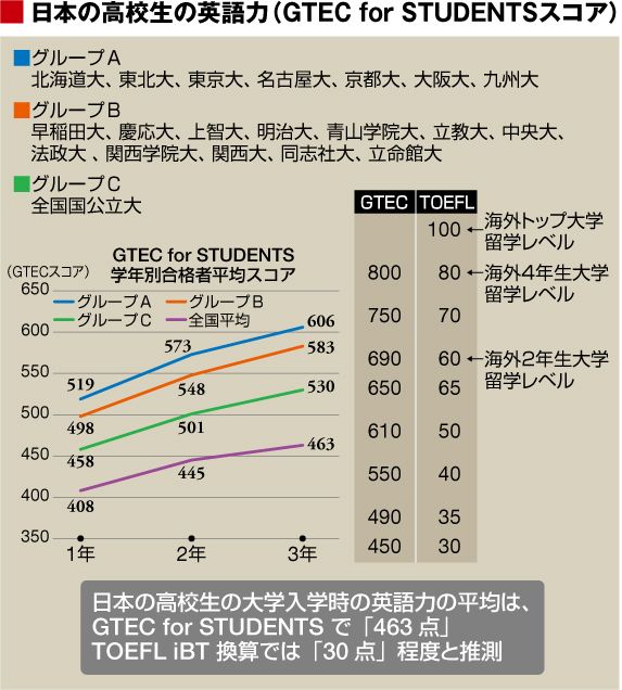 このデータは、まず、各大学合格者の高校3年間のGTEC平均スコアを算出、それを、TOEFL iBT(インターネット版のTOEFLテスト、120点満点)との相関を基にして、「国内大学合格に求められる英語力」と「海外留学で求められる英語力」の差を推定したものである。ちなみに、GTECはリーディング、リスニング、スピーキング、ライティングの3技能を試すテストであり、810点が満点となる。