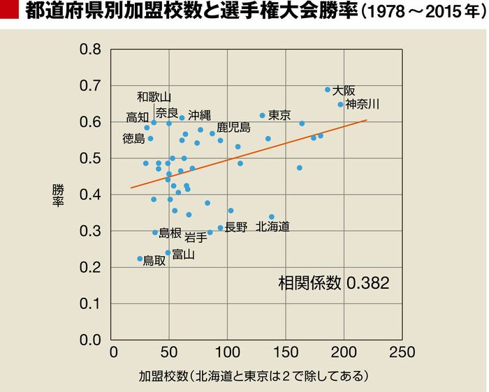 すべての都道府県が夏の選手権大会に毎年参加するようになった1978年から2015年までの都道府県別加盟校数(平均。北海道と東京は出場枠2で除した数)と夏の選手権大会での勝率をプロットすると、相関係数は0.38でプラスの相関がみられ、確かに加盟校の多い地域は勝率もよいことがわかる。大阪、神奈川、東京などである。