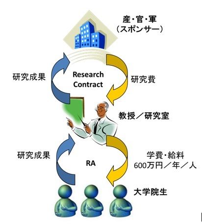 どこからそんなおカネが出てくるのか。それは、先生が産・官・軍などのスポンサーから取ってくる研究費である。アメリカの大学における研究費の主な使途は学生を雇用する人件費なのだ。そして先生は研究費をもらう代わりに、期待される研究成果を上げる責任をスポンサーに対して負う。