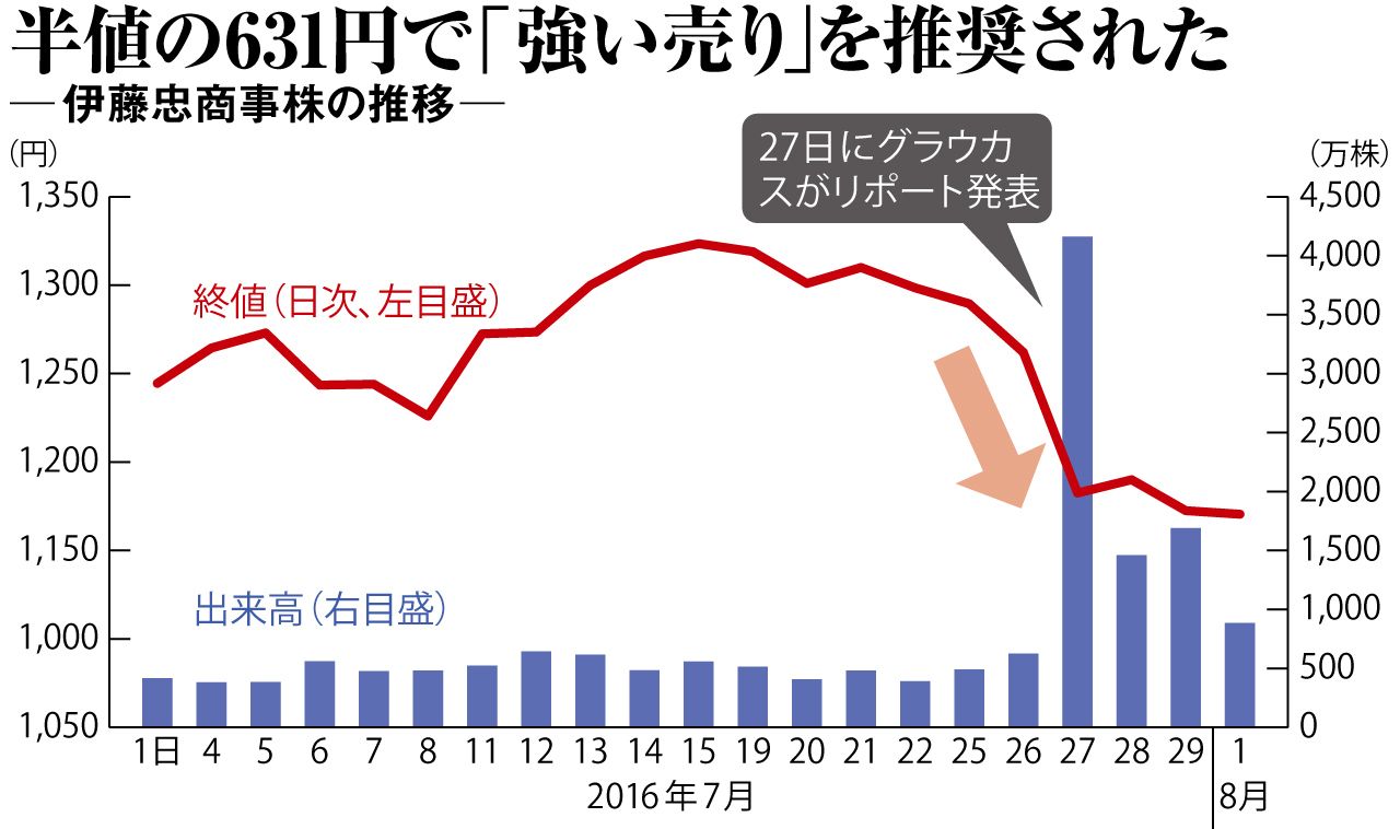 同グループは7月27日、東芝の不適切会計と比較する強い論調で、「伊藤忠が過年度決算で利益の水増しを行っている」とする調査リポートを公表。目標株価を、前日終値の半値である631円に据え、「強い売り」を推奨した。当日の株価は一時約10%下落し、1135円と年初来安値を更新した。