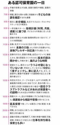 保育の専門家として、これまでは認可保育園の運営には常に、保育士2人以上の配置が義務付けられていたが、国は保育士不足解消のため、今年4月から子どもの少ない朝夕に限り、保育士1人に加え、研修を受けた保育ママなど資格を持たない人による保育を認めるようにした。この規制緩和に対し、現場では「朝夕は異年齢の子どもを一緒に保育するのでトラブルが起こりがち。逆に専門性を備えた保育士の確保が必要」「無資格者ができる仕事だと思ってほしくない」という反対意見も多い。