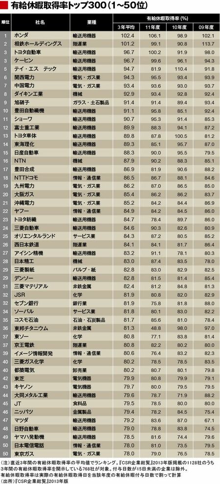 「なかなか思うように有給休暇が取れない」。そうお嘆きのビジネスパーソン諸姉諸兄も多いのではないだろうか。自社と比較したいこともあり、よその会社の有給休暇取得状況は気になるところ。従業員に優しいとも言われるCSRに積極的な企業の実態はどうなのか。『CSR企業総覧』2013年版の掲載企業のうち、3年間の有給休暇取得率を回答、開示している768社を対象に、有給休暇取得率をランキングしてみた。