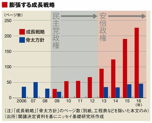 政府の経済運営の基本方針は小泉政権下では「骨太方針」、2009年民主党政権下では「成長戦略」で示され、現在の安倍政権では「骨太方針」、「成長戦略」の両方が毎年策定されている。このうち、「成長戦略」のページ数(A4判)はここ数年急増しており、2016年度版ではついに本文だけで200ページを超えた。これだけ量が多いと成長戦略の内容を理解するだけでも至難の業だろう。
