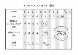 プレショット・ピラミッドのブロックをどのぐらい上手に積み上げることができているか。その指標となるのがメンタルスコアカード(右)だ。通常のスコアカードは各ホールの打数を記入するが、ここでは打数とは無関係に、各ショットに対する自分のメンタル面の状態を自己採点して記入する。