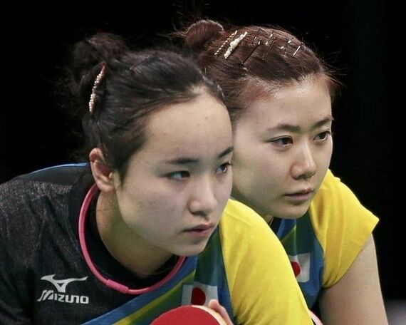 8月12日、リオデジャネイロ五輪、卓球の女子団体1回戦、日本はポーランドを3─0のストレートで破り、8強入りした。写真はダブルスで勝った福原愛(右)、伊藤美誠(左)組(2016年 ロイター/Alkis Konstantinidis)