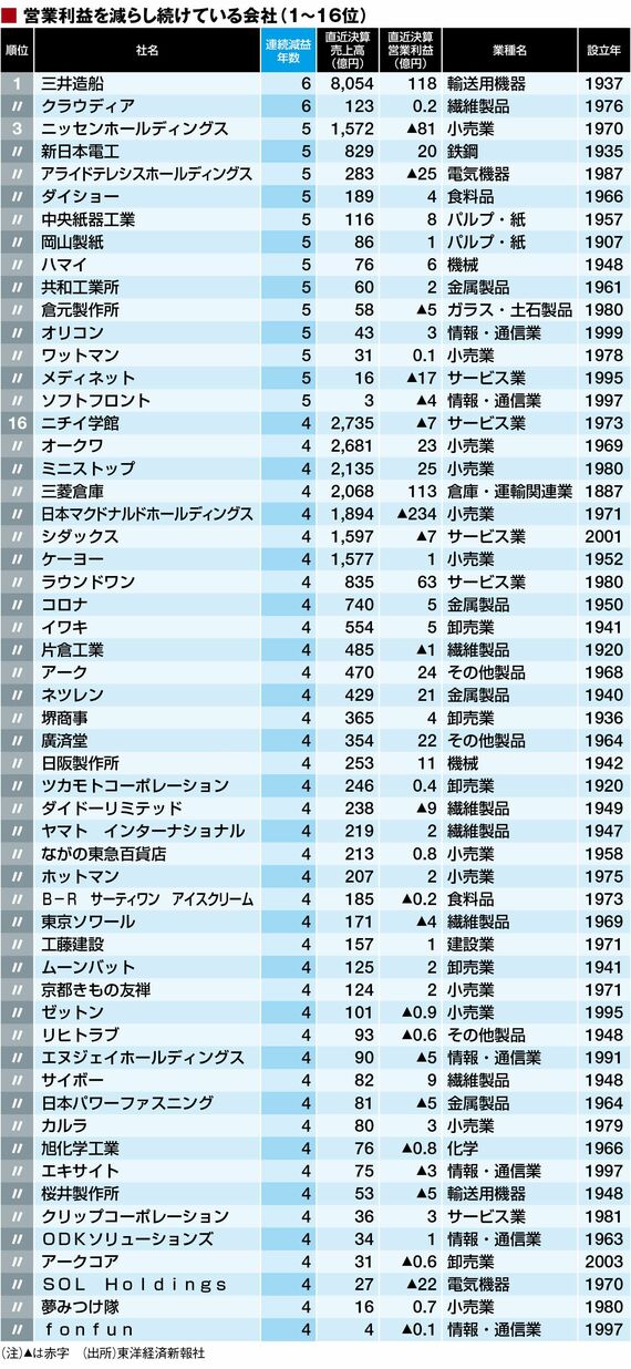 政治・経済・投資 最新!連続減益「ワースト130社」ランキング 最長は6年連続!赤字会社の姿も目立つ 2分で読める 公開日時:2016/08/19 06:00 東洋経済オンライン編集部 フォロー 1/4 PAGES 2/4 PAGES 次ページが続きます:【続いて3年連続減益の会社】 3/4 PAGES 4/4 PAGES